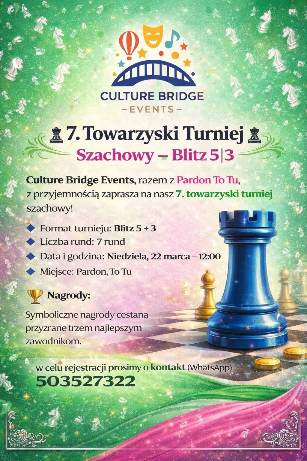 Event details 22.03.2026 12:00 Aleja Armii Ludowej 14, 00-637 Warszawa Culture Bridge Events, we współpracy z Pardon, To Tu, z przyjemnością zaprasza na nasz 7. przyjazny turniej szachowy! Format turnieju: Blitz 5+3 Rundy: 7 rund Data i godzina: Niedziela, 22 marca – 12:00 Nagrody: Symboliczne nagrody zostaną przyznane trzem najlepszym zawodnikom. Rejestracja: https://forms.gle/RA1vFfgTpSXMUp2w5 Dołącz do nas, aby przeżyć emocjonujący turniej szachowy, poznać innych graczy i spędzić czas w ciepłej, przyjaznej atmosferze! Save Event to Calendar Save to iCalendar Save to Google Calendar Save to Outlook Save to Outlook Online Save to Yahoo! Calendar
